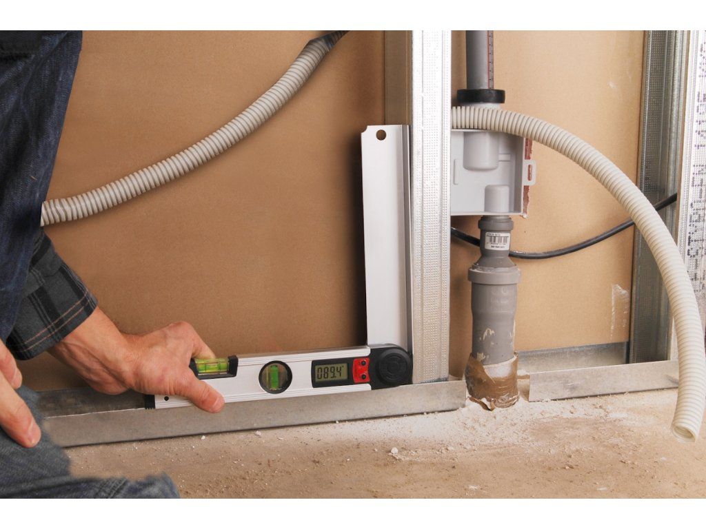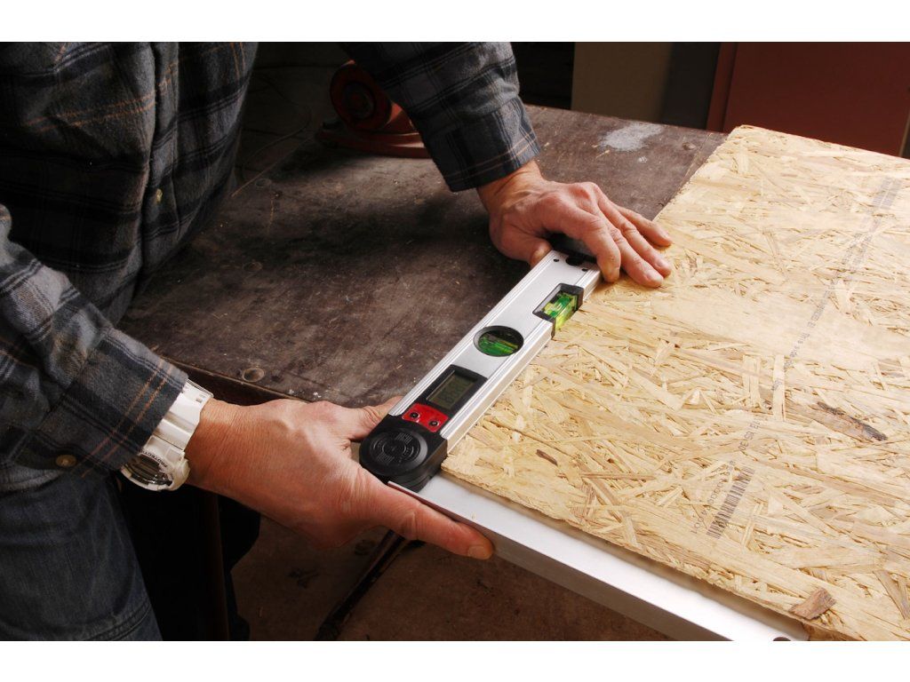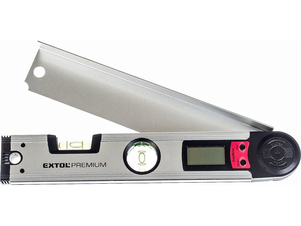 Alumínium kivitelű (falvastagság 1,5 mm), kihajtható vonalzó, furat a felakasztásához, LCD kijelző, vízszintes és függőleges mérés. Teljes hossz 305 mm, szögmérés pontossága ± 0,3 mm; vízszintmérés pontossága 0,5 mm/m. A tápellátásról 1 db 3 V-os CR2032 elem gondoskodik.