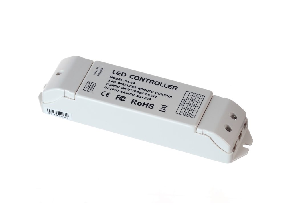 Tartozék a WIFI 666 rendszerhez - rend.sz. PN780601 és/vagy vezeték nélküli vezérlőkhöz- rend. sz. PN780607, rend.sz. PN780608, rend.sz. PN780609, rend.sz. PN780610 és rend.sz. PN780611. Vezeték nélküli controller 12V DC/ 24 V DC árammal működő lámpákhoz. 4 csatorna, max. terhelés 480 W 24V - 120 W mellett /csatorna 24V max. terhelés 240 W 12V - 60 W mellett /csatorna 12V mellett. A controller a WIFI 666 rendszertől vagy a vezeték nélküli vezérlőpult kapja a jelet, és adja át az impulzust a bekapcsolt lámpának. A kontrollernek köszönhetően szabályozható a fényerősség (DIM), a fényhőmérséklet (TAS) és a fényszín (RGB/RGBW).