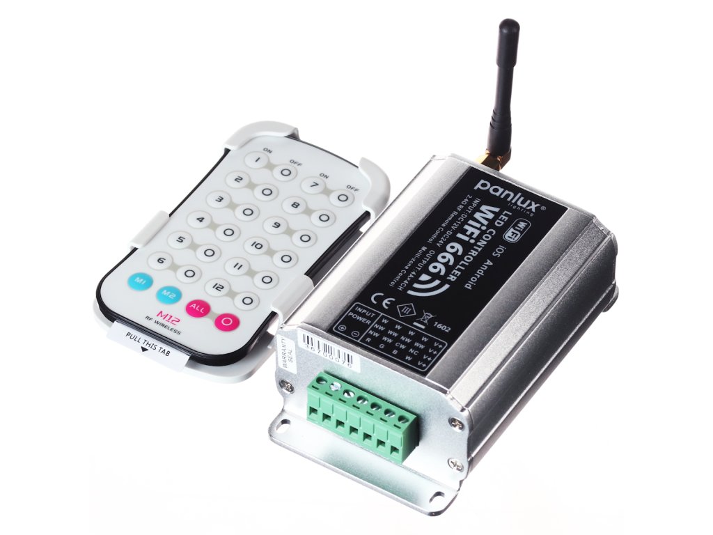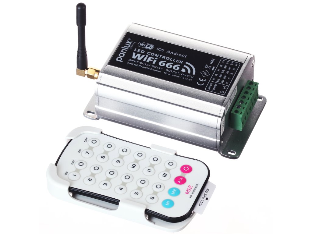 Az intelligens Wifi666 rendszer lehetővé teszi a háztartási világítás szabályozását a mobiltelefonra vagy táblagépre telepített alkalmazás segítségével. 12 ZONE - akár 12 önálló lámpazóna vezérlését lehetővé teszi Standard kommunikáció: 2,4 GHz WiFi 802.11b/g/n Kimenet: PWM CV 12÷24 V= ( max. 4 A × 4 CH max. 16 A ) A Wifi 666 alkalmazás ingyenesen hozzáférhető a Google Play (Android) és App Store (iOS) áruházakban. Az alkalmazás az alábbiakat teszi lehetővé (a használt lámpák és fényforrások számától függően) :1. Fényerősség állítás (sötétítés) - DIM 2. Állandó fényhőmérséklet állítás (a melegtől a semlegesen át a hideg fehérig) - TAS 3. Fényszín állítás - RGB és RGBW. A csomag tartalma M12 távirányító, amely lehetővé teszi a rendszerbe csatlakozó lámpák telefon nélküli vezérlését. - A vezérlő tápellátása: BAT 3V= (CR2032) - A vezérlő hatótávolsága: max 30m - A vezérlő méretei: 104 × 60 × 9 mm A rendszerhez falra szerelhető design szabályozó vásárolható, amely helyettesíti a szokásos kapcsolót, és komplex valamint kényelmes működést biztosít: VEZETÉK NÉLKÜLI VEZÉRLŐ, 1 ZÓNA - lehetővé teszi 1 lámpazóna vezérlését, rend.sz. PN780607, rend.sz. PN780608 és rend.sz. PN780609, -